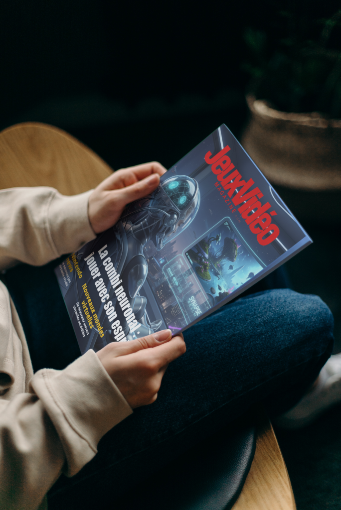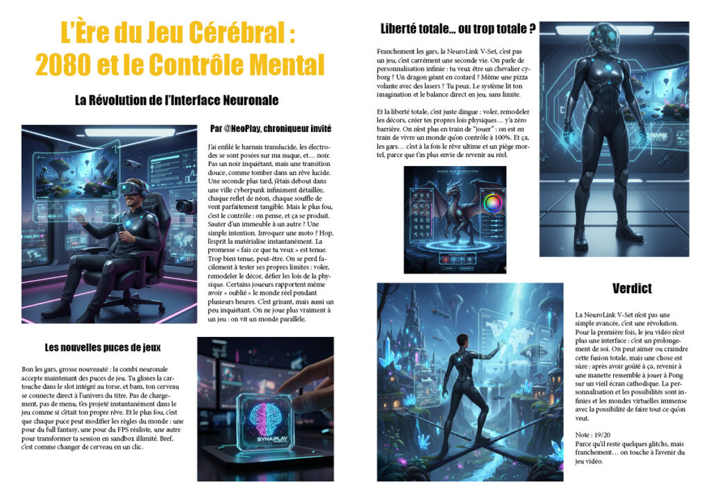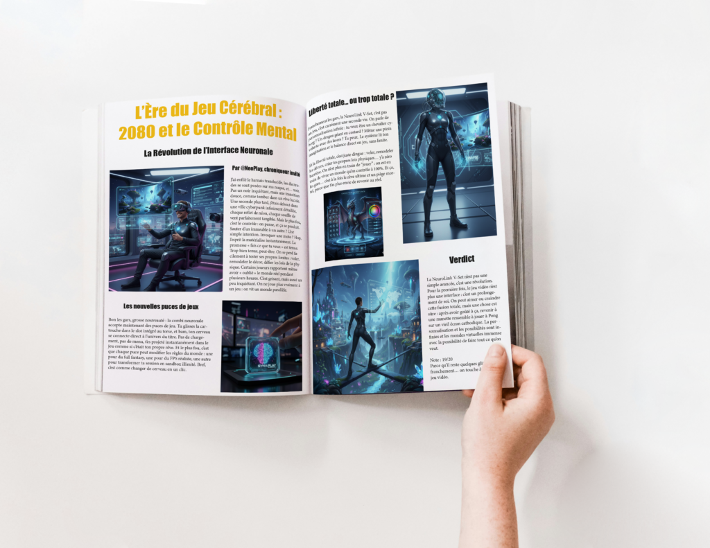 Voici un magazine ici « Jeux Vidéo.com magazine imaginant ce qu’il serait dans le futur et de quoi il pourrait parler avec une invention futuriste qui correspond au magazine. Ici l’invention est la combi neuronal qui permet de jouer aux jeux vidéo avec son cerveau grâce à la combi. Le magazine parle donc de cette combi neuronal et de ce qu’elle permet de faire. Il y a la cover du magazine et une double page d’explication. Pour finir une mise en situation de la cover du magazine et une de la double page du magazine.